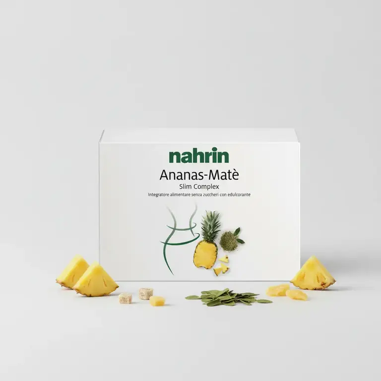 Fibra solubile NUTRIOSE da mais, inulina, DNF-10 (lievito idrosilato: peptidi da Saccharomyces cerevisiae), estratto secco di ananas (Ananas comosus (L.) Merr., stipiti) titolato allo 0,3% in bromelina, estratto secco di matè (Ilex paraguariensis A. St.-Hil., foglie) titolato al 4% in caffeina, estratto secco di orthosiphon (Orthosiphon aristatus (Blume) Miq., foglie) titolato allo 0,1% in sinensetina, aroma, acidificante: acido citrico; edulcorante: glicosidi steviolici da stevia; agente antiagglomerante: biossido di silicio (nano); colorante: beta carotene; picolinato di cromo, biotina (D-biotina). Faq Domande e risposte A cosa serve Ananas Matè Nahrin? Ananas Matè Nahrin è un integratore…