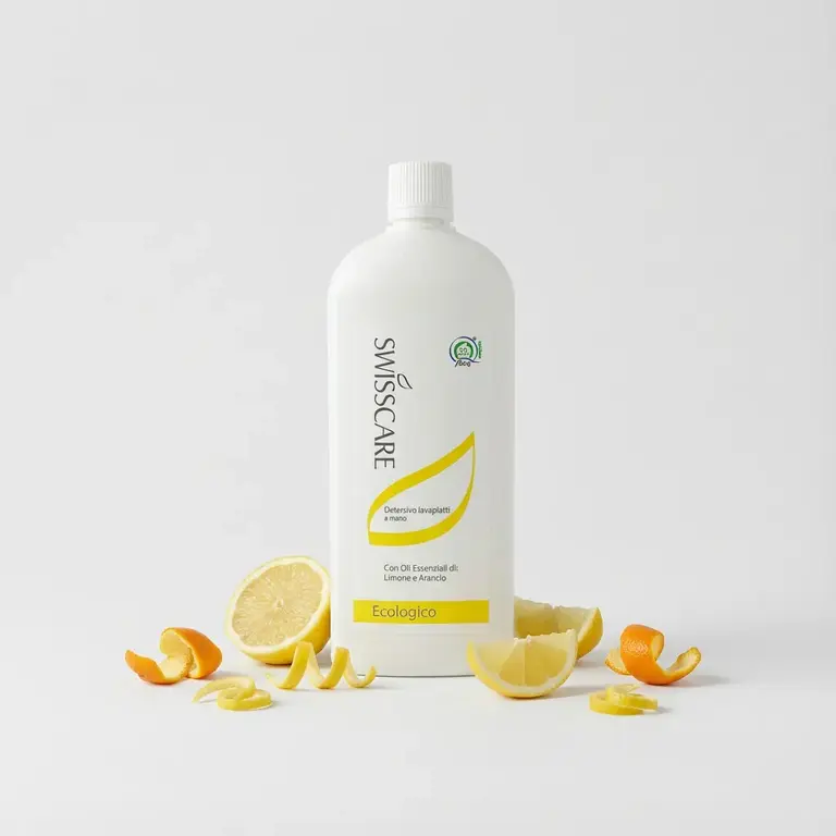 Prodotto Lavapiatti a Mano: Detersivo per piatti e stoviglie con tensioattivi di origine vegetale, oli essenziali naturali di limone e arancio da coltivazione biologica. Concentrato, perfetto per lavare e sgrassare efficacemente tutte le stoviglie. È formulato con oltre il 97% di componenti naturali e non secca o rovina le mani. Certificazione BIOS - EcoClean.